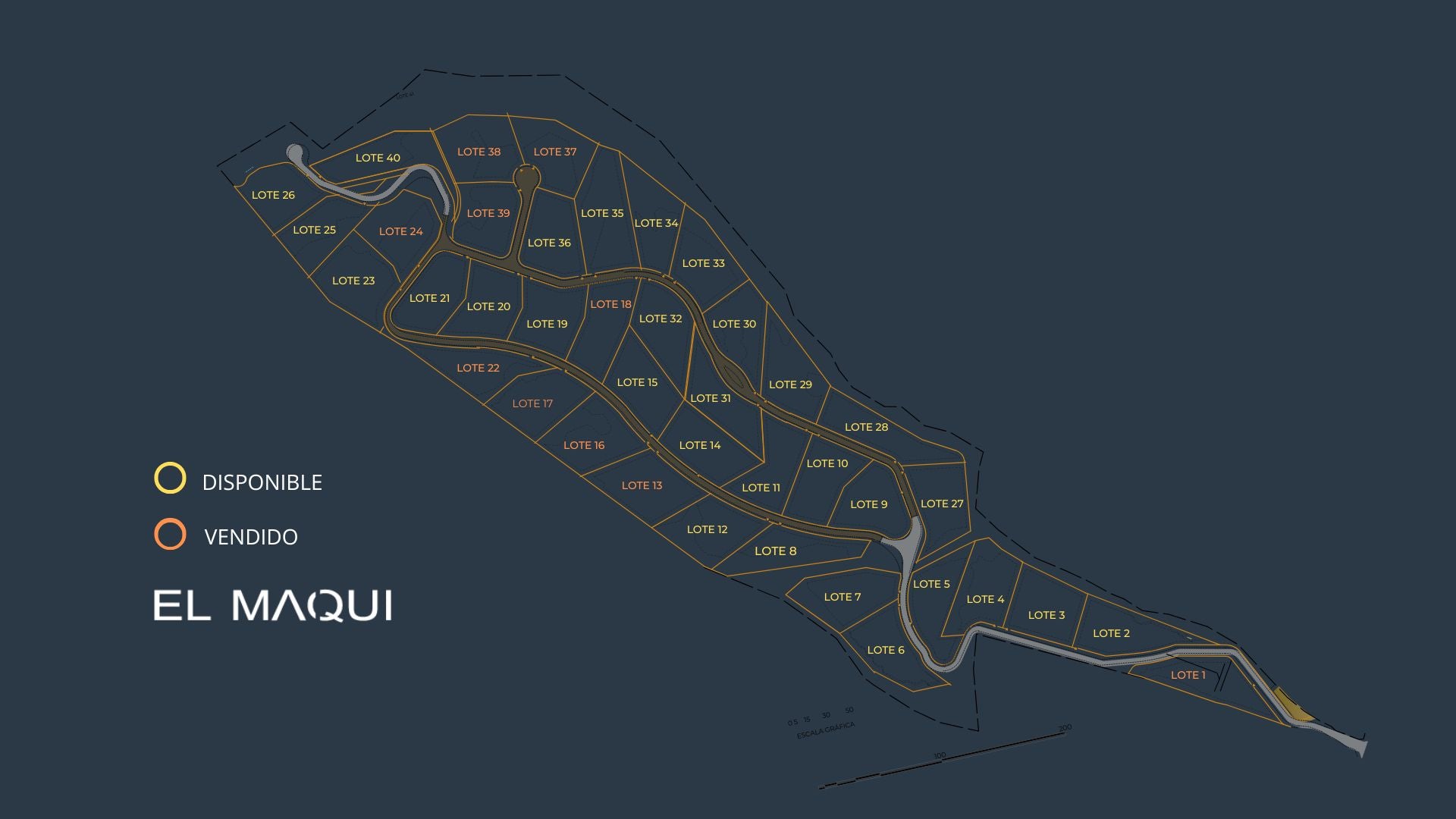 Cuenta con 40 exclusivos lotes des de 5000 m2 que es su mayoría son sitios en planicies planas.